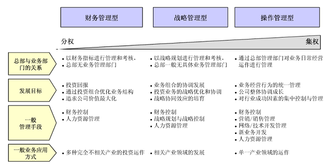 管控模式根據(jù)集分權(quán)程度,一般分為財務(wù)管控型、戰(zhàn)略管控型和操作管控型,如下圖所示:
