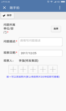 員工在集團(tuán)所屬所有經(jīng)營(yíng)和租賃場(chǎng)所發(fā)現(xiàn)人的不安全行為、物的不安全狀態(tài)、環(huán)境的不安全因素等問題,可登錄“深圳特發(fā)集團(tuán)”企業(yè)微信號(hào)(見圖1)隨手拍模塊進(jìn)行上報(bào)(見圖2、3),上報(bào)內(nèi)容包括問題所屬單位/部門(可在模塊中選擇)、問題的描述及問題照片,所有信息填報(bào)完成后點(diǎn)擊保存,信息將自動(dòng)導(dǎo)入安全生產(chǎn)信息系統(tǒng),上報(bào)至問題所屬企業(yè)安委辦負(fù)責(zé)人。