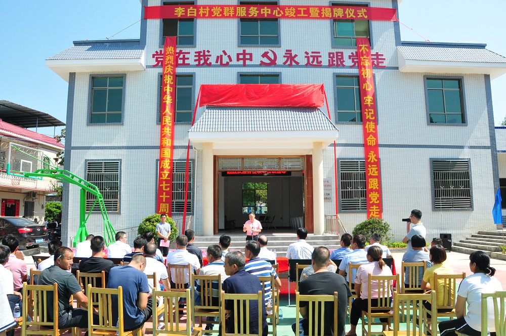 9月26日上午,在新落成的黨群服務中心前,李白村隆重舉行黨群服務中心竣工暨揭牌儀式。集團黨委書記、董事長張俊林、黨委副書記童慶火、東源縣委常委、深圳駐東源工作組組長王卓勇等出席儀式,參觀黨群服務中心及文化廣場建設成果,并為黨群服務中心揭牌。