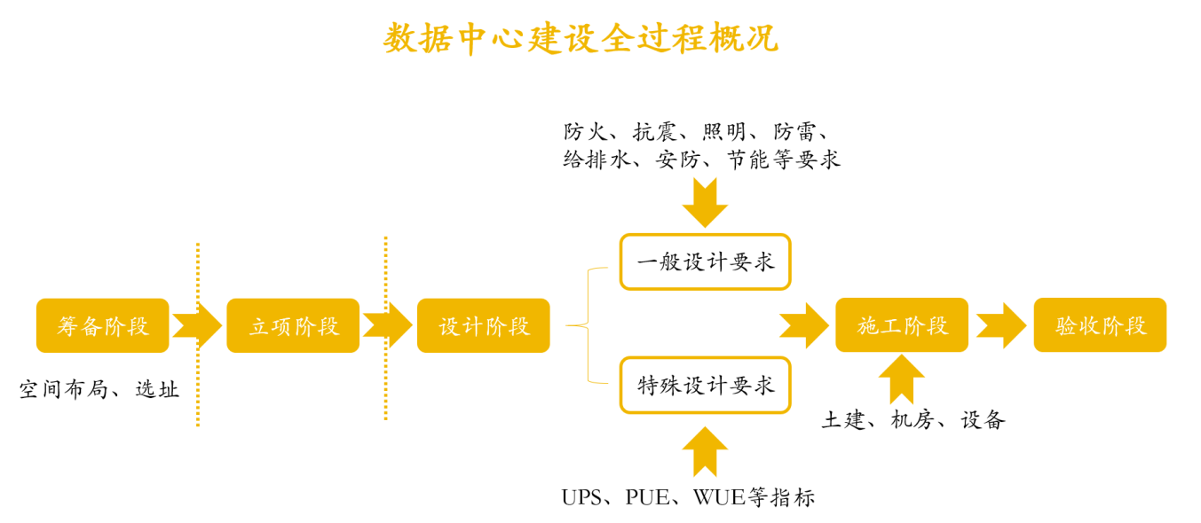 數(shù)據(jù)中心在本質(zhì)上屬于建筑物的一種形態(tài),因此從建設(shè)流程上而言,與普通的地產(chǎn)項(xiàng)目比較接近(見下圖所示),按照階段都可以劃分為:籌備—立項(xiàng)—設(shè)計(jì)—施工—驗(yàn)收。