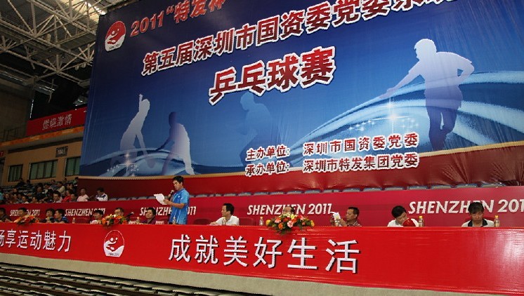 開幕式于10月29日上午8:30舉行。市國資委黨委書記柏立新,特發(fā)集團(tuán)黨委書記、董事長劉愛群、黨委副書記、總經(jīng)理施長躍,國資委黨辦主任李明、副主任張曉中、唐明通,以及國資委系統(tǒng)企業(yè)的領(lǐng)導(dǎo)出席開幕式。開幕式由集團(tuán)總經(jīng)理施長躍主持。此時的羅湖體育館一派歡快、濃烈的氛圍:主席臺正面高樹印有本次比賽徽標(biāo)和“2011‘特發(fā)杯’第五屆深圳市國資委黨委系統(tǒng)乒乓球賽”字樣的巨幅背景板,四周掛滿國資委和系統(tǒng)各企業(yè)的旗幟與祝比賽圓滿成功的條幅,以及“暢享運(yùn)動魅力,成就美好生活”、“樹競技風(fēng)尚,展國企風(fēng)采”等標(biāo)語,各單位啦啦隊和觀眾坐滿看臺。伴隨著熱烈歡快的運(yùn)動員進(jìn)行曲,來自國資委系統(tǒng)21家單位的22支代表隊,在美麗端莊的引導(dǎo)員帶領(lǐng)下,隨著高舉國資委旗幟的旗手、護(hù)旗手依次入場,隊員們意氣風(fēng)發(fā),精神飽滿,步伐矯健,隊列整齊。在全體起立奏唱國歌、莊嚴(yán)的升國旗儀式后,集團(tuán)董事長劉愛群和國資委黨委書記柏立新分別代表承辦方和組委會先后致辭。