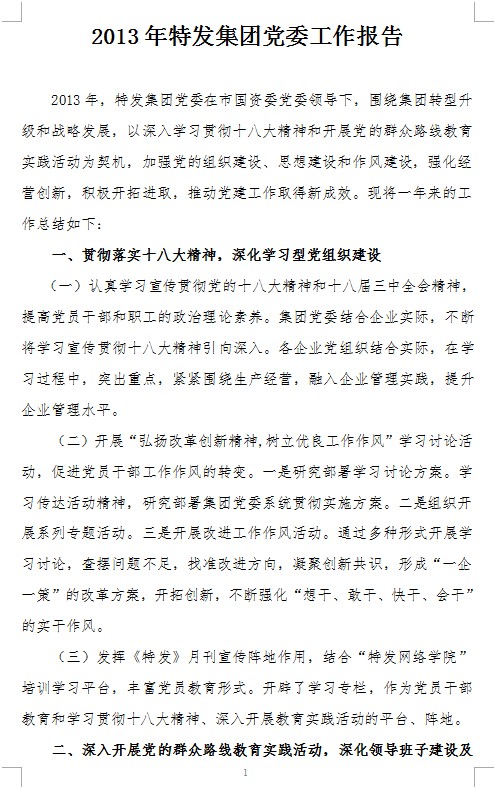 2013年特發(fā)集團黨委工作報告